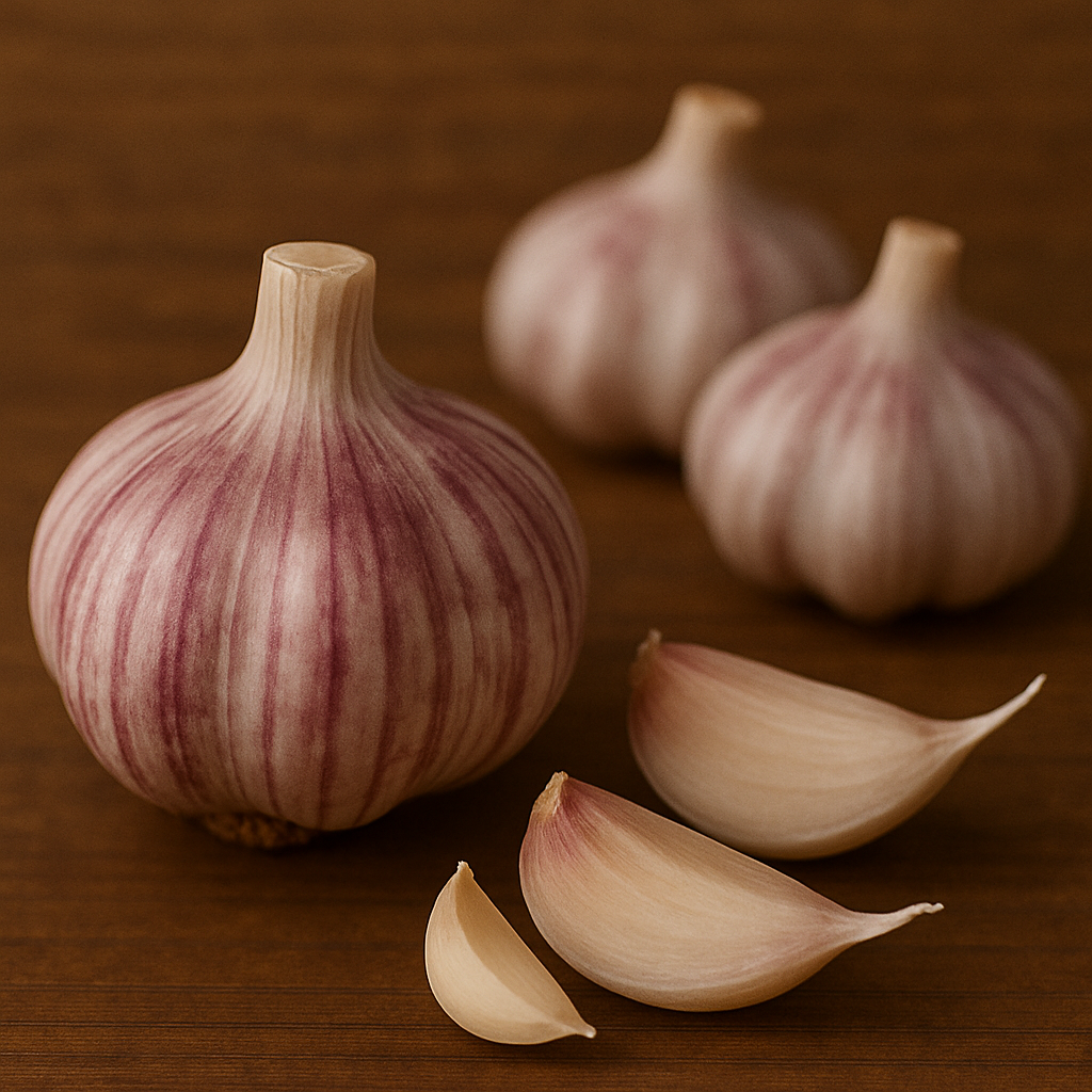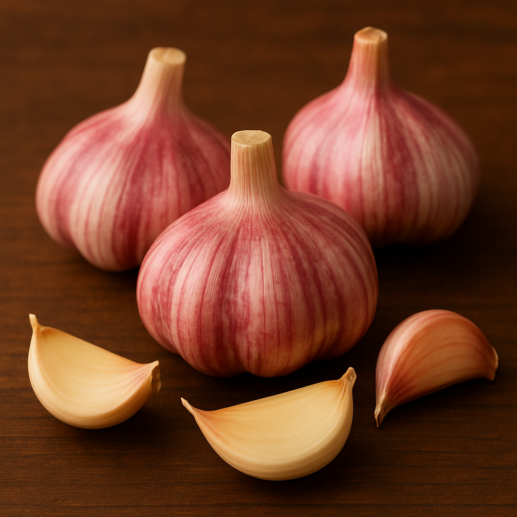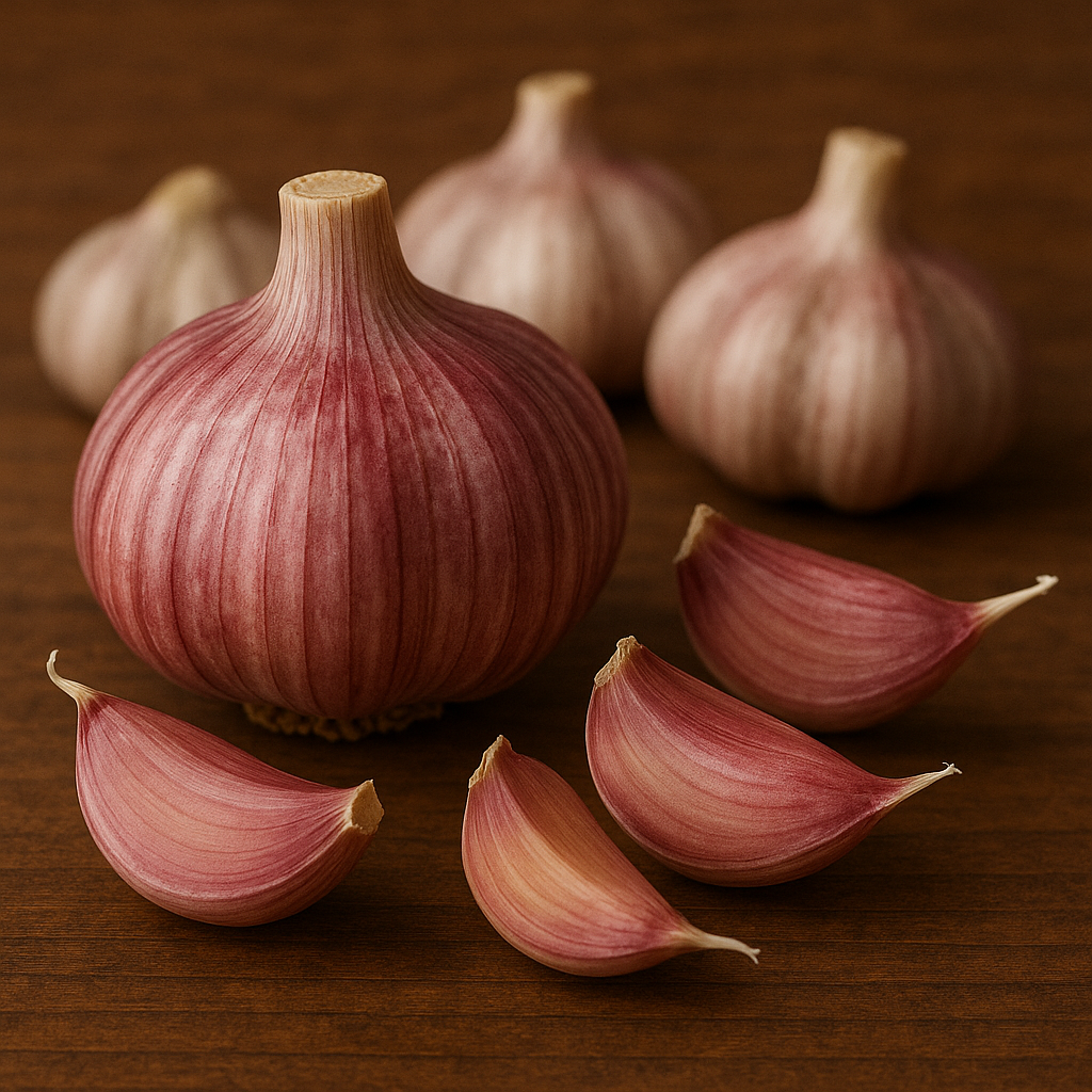 A great hardneck garlic in so many ways! Romanian Red is in the Porcelain family and produces large heads with big cloves and a hot, long lasting flavor with a great storage life. This garlic is known for its high allicin content. Allicin is associated with several health benefits due to its antioxidant, antimicrobial and potentially cardioprotective properties.